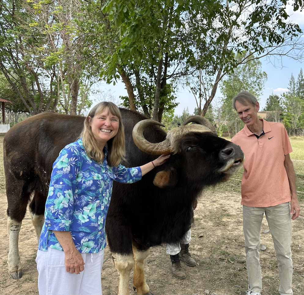 We even managed to slip in celebrating our 36th wedding anniversary near Khao Yai National Park. When we saw a large wild bull on a walk, we turned back knowing the Gaur, the largest wild cattle in the world, lives in these hills. However, after learning that the research station cares for three blind Gaur, we returned and realized our scary bull was a gentle female.
